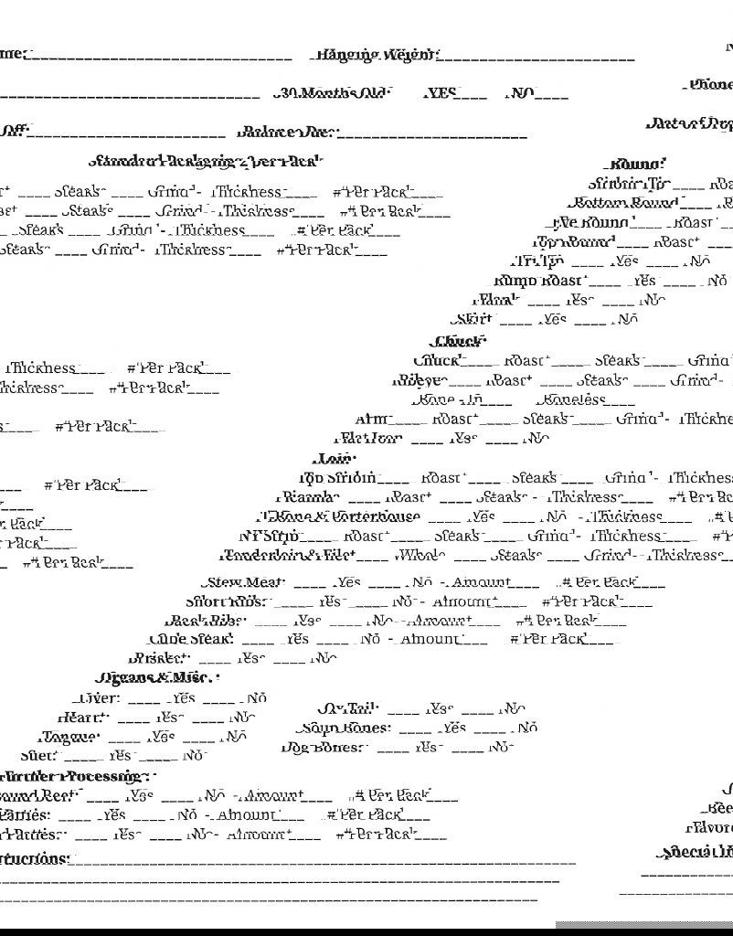お肉の部位によって、塊かステーキか挽き肉にするか、などのカットの仕方、ステーキ場合は厚さ、一袋に何切れ入れるかなど分け方、などが指定の用紙に書いてあります。
