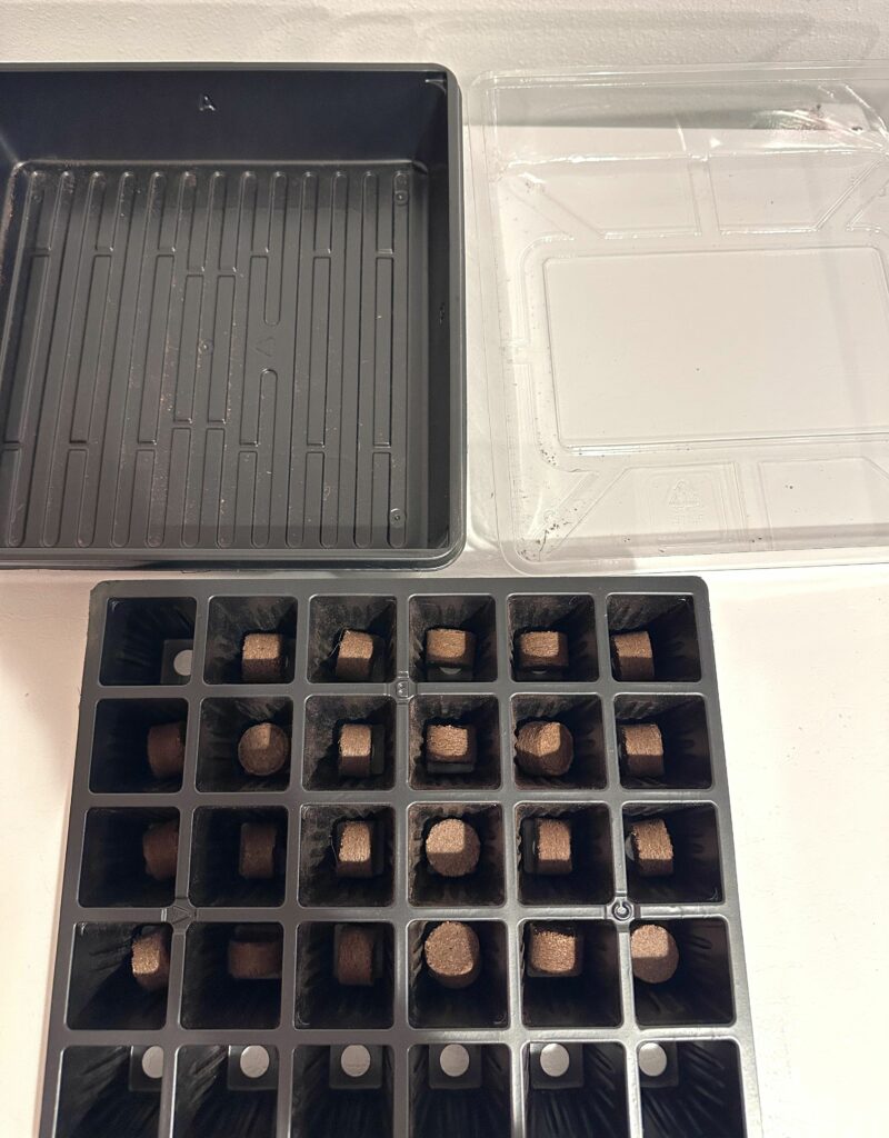2種類のトレイ、透明のカバー、ペレット(種まき用の土)がセットになっています(写真の茶色い塊がペレットです)