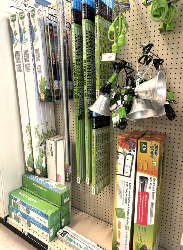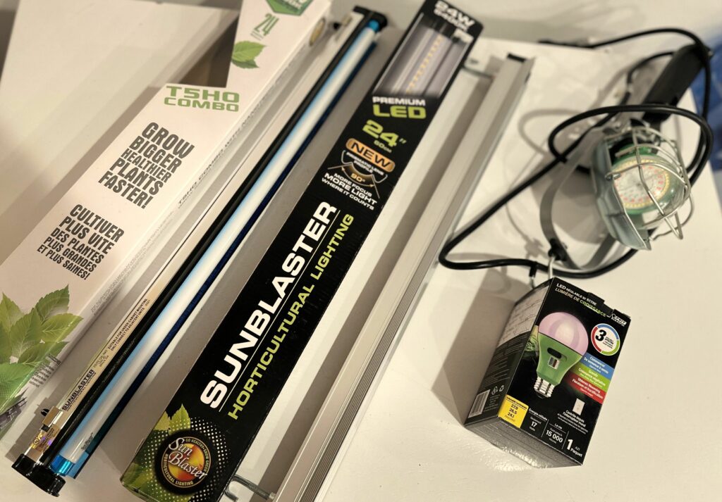 ウィスコンシン州の冬の日差しでは、夏野菜が発芽するために必要な光が足りません。足りない光を補うために、1日に14~16時間グローライト点けておきます。